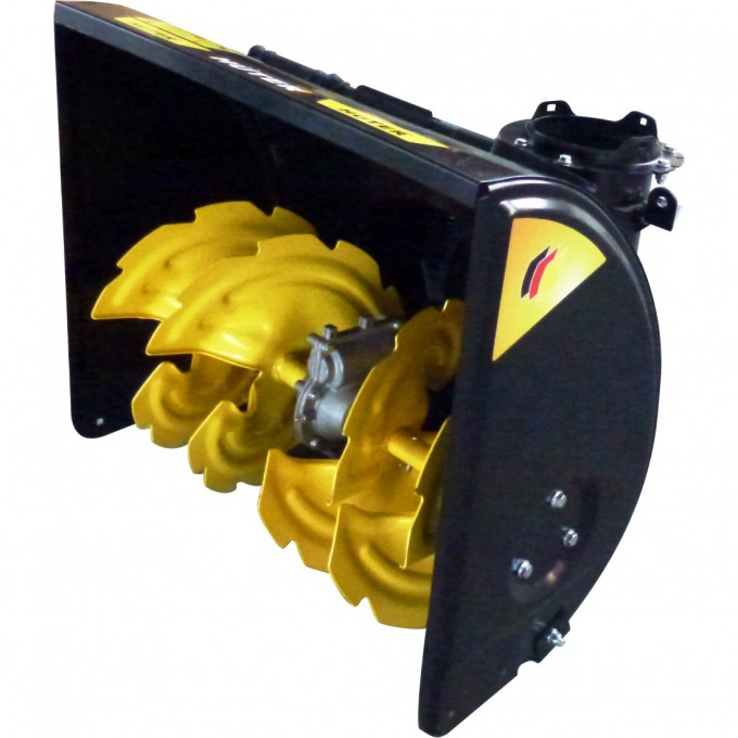 - Конструкция насадки включает в себя снегоуборочный ковш, металлический шнек и желоб для выброса снега